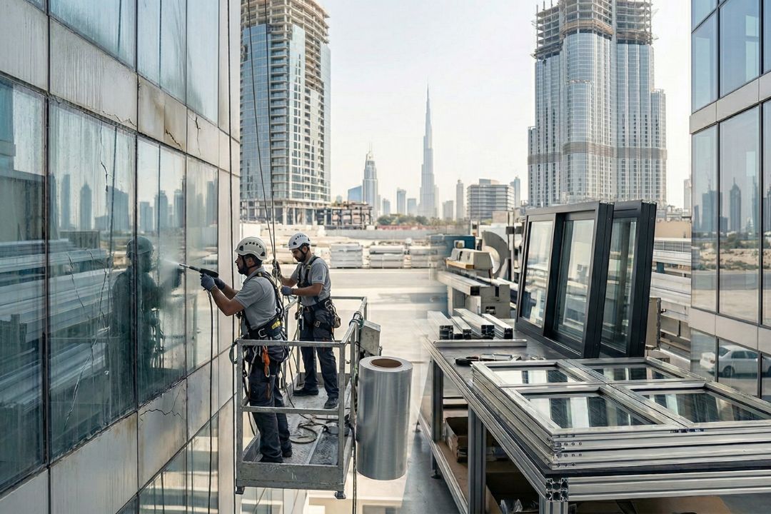 The UAE climate is one of the harshest in the world for building exteriors. Extreme heat, UV radiation, sandstorms, and coastal humidity all take a toll on aluminium frames, glass panels, sealants, and cladding systems.